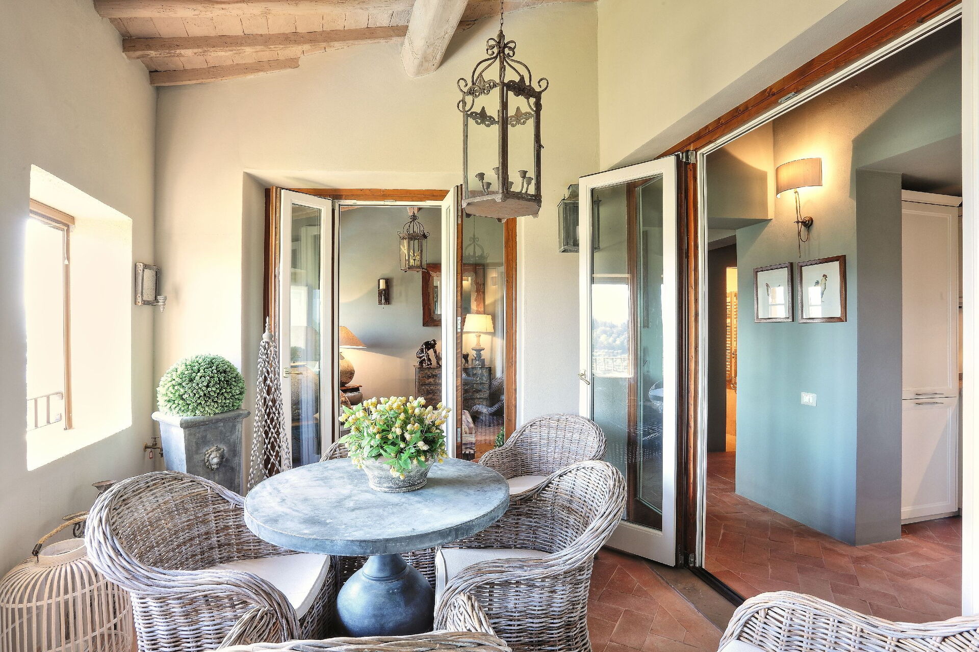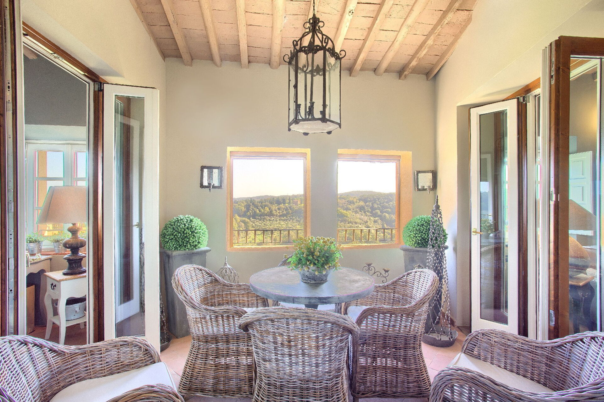 Tredje etasje: stue, spisestue, kjøkken ((komfyr, kjøleskap, stekeovn, oppvaskmaskin), bad med dusj, overbygd loggia (lenestoler og bord) med panoramautsikt over åsene, svømmebasseng og golfbane.